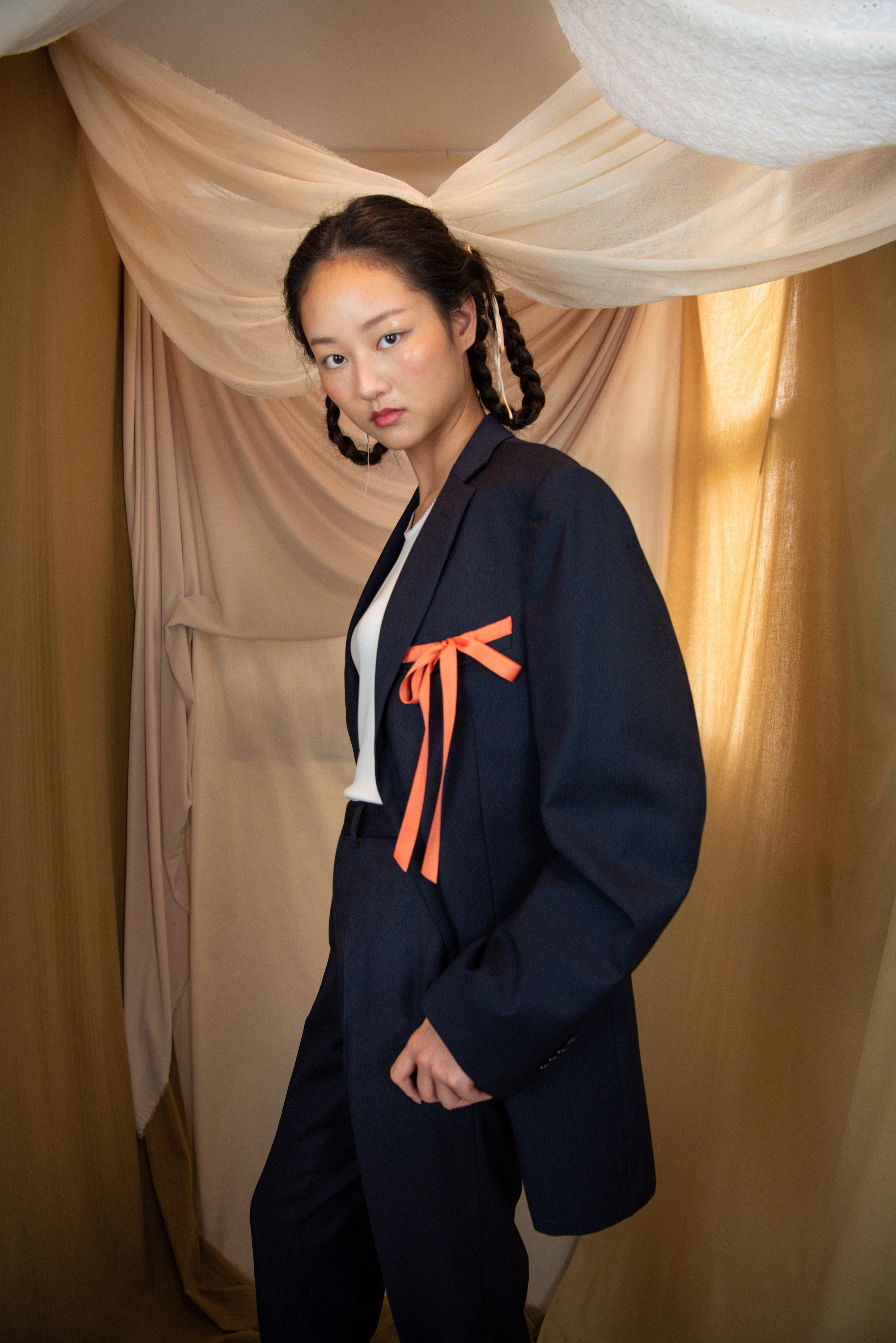 Oversized suit with ribbon details.